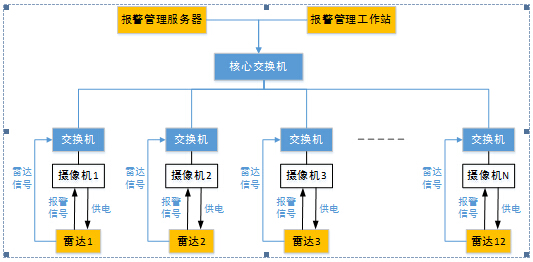 Ø 每台雷达通过通过武警岗楼布设的交换机连接到指挥中心的PSIM-2020雷达报警管理平台,实现报警管理和配置管理。
