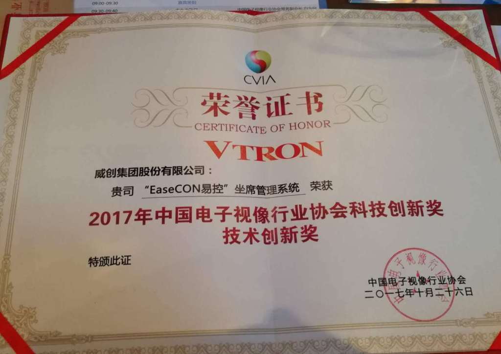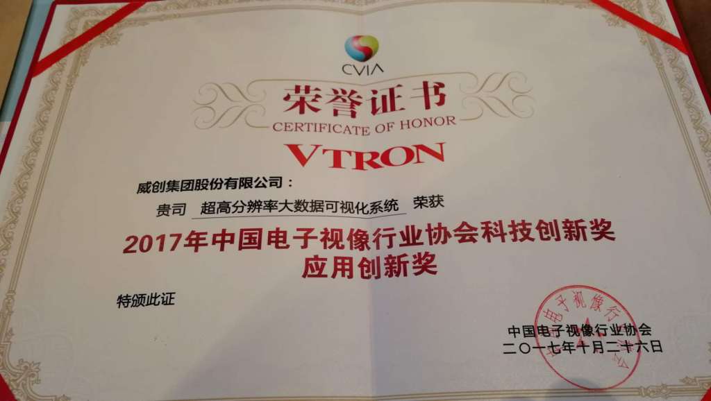 2017年10月26日,在中国电子视像行业协会举办的“2017年中国音视频产业创新奖”表彰大会上,威创“超高分辨率大数据可视化系统”获得了年度应用创新奖,“‘EaseCon易控’坐席管理系统”也拿下了年度技术创新奖。