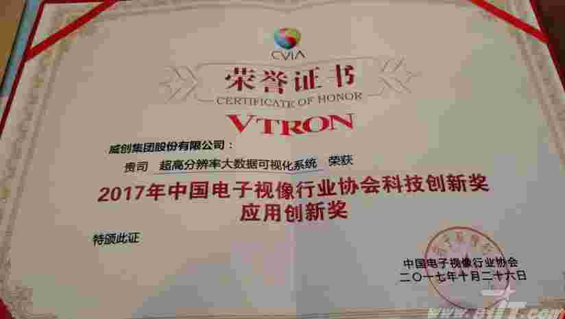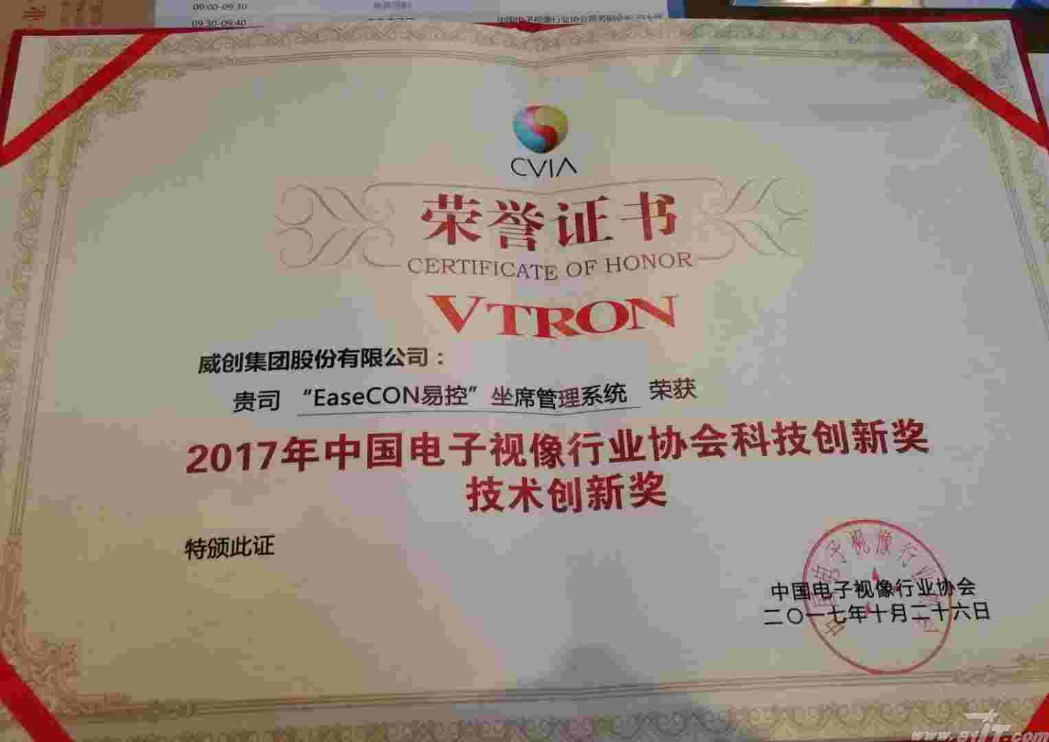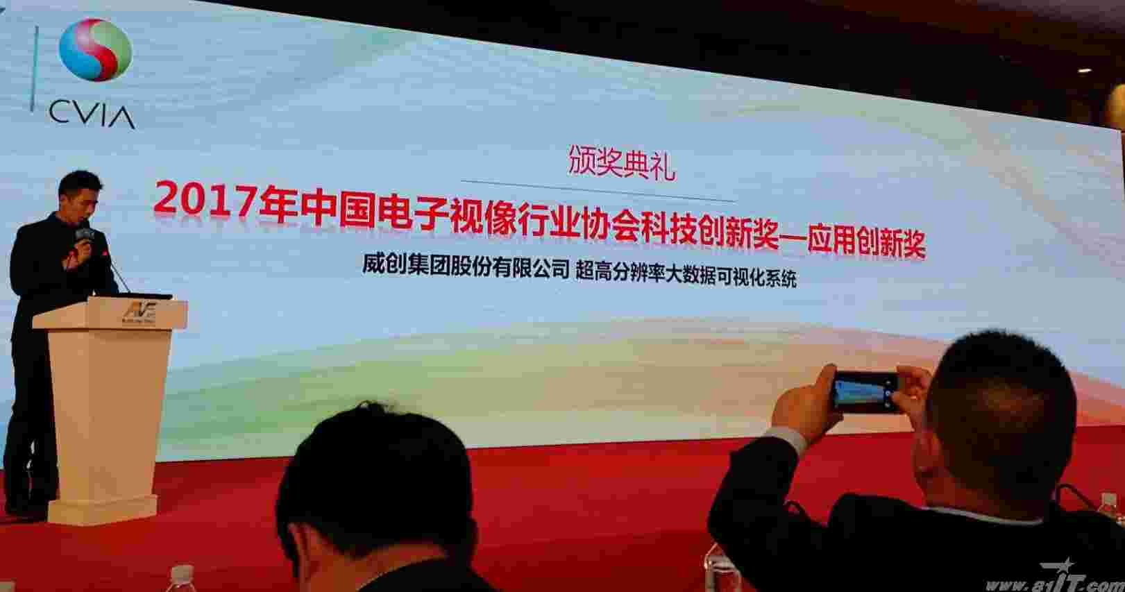 2017年10月26日,在中国电子视像协会举办的“2017年中国音视频产业创新奖”表彰大会上,威创“超高分辨率大数据可视化系统”获得了年度应用创新奖,“‘EaseCon易控’坐席管理系统”也拿下了年度技术创新奖。