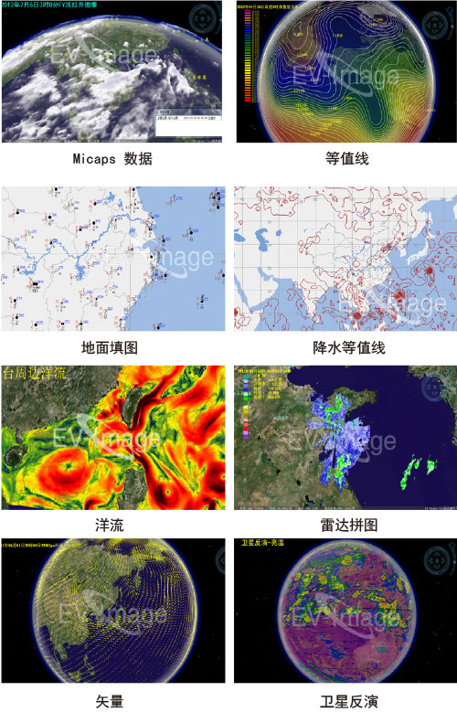 · 支持MICAPS 所有格式数据的二三维一体化显示与仿真;