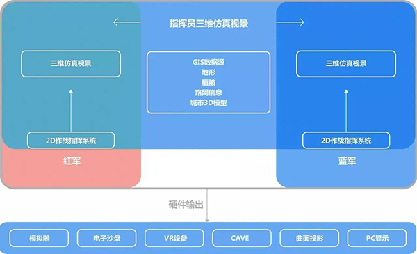 海陆空一体化协同作战指挥仿真平台是基于UNISOL软件平台进行的仿真视景开发,可对接分析系统,最终集成到模拟器、电子沙盘、VR设备、CAVE等硬件输出设备上流畅地运行交付。平台改变传统推演模式,让受训者不必局限于天气、场地空间与费用等限制。通过对战场环境、红蓝双方兵力部署、武器装备、战地气象进行建模和仿真,围绕任务目标进行推演覆盖海、陆、空、电领域联合作战方案,实现作战指挥、数据采集、策略验证、战术优化、装备性能评估等推演目的。