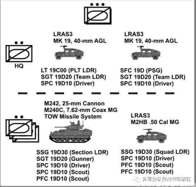 装甲旅战斗队(ABCT)中的合成装甲营侦察排装备有三辆陆军机动战斗车(CFVs)和五辆配备有远程高级侦察监视系统(LRAS3s)的高机动性多用途轮式车(HMMWVs)。