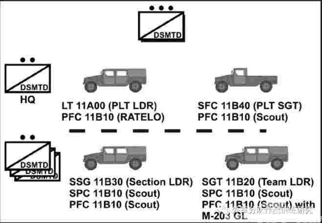 为了机动的目的,可能将排根据任务编组为更小的侦察队。侦察小队通常包括单车和车组人员,也可能需要根据METT-TC情况,把多部车辆和车组人员进行合并。