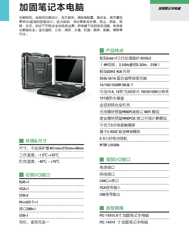 功能特性:全新的功能设计,自主研发,具有高配置、高安全、高可靠性 等特点;超强的坚固设计:适合振动、冲击等恶劣环境,防尘、防振、防 摔、抗压,阳光下可视;安全的信息运算:防电磁干扰和信息泄漏,有效保 证数据安全。适合国防、公安、消防、交通、石油、勘探、船舶、煤炭等 行业。