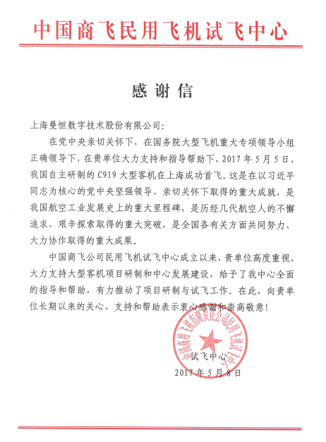 央视新闻频道对曼恒数字为C919开发的机载测试系统地面验证平台进行了重点报道,商飞试飞中心领导也专程来到曼恒数字总部送来感谢信,高度肯定和评价了曼恒数字的技术和服务水平。