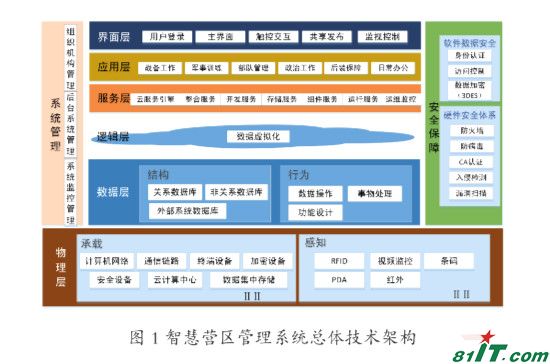 2.2?系统总体架构设计。在智慧军营建设需求分析基础上,按照“数字化、智能化、网络化、互动化、协同化、融合化”要求,总体规划智慧军营管理系统体系框架、功能组成,分层设计系统的技术体系结构,梳理归纳了信息交换内容和交互方式,确定了系统研制须遵循的标准规范和可靠性设计指标。通过对军营内人与物及其行为的全面感知和互联互通,大幅优化并提升部队各项工作运行的效率和效益,实现工作更加便捷、环境更加友好、资源更加节约的可持续发展的军营,为部队全面建设和战斗力生长提供总体设计架构和详细设计指导。参考 SOA、物联网和云计算技术架构,系统从逻辑上划分为物理层、数据层、服务层、应用层、界面层,如下图如图 1 所示。