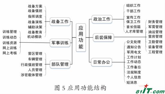 3. 应用功能。应用功能组织如图 5 所示,业务应用处理分系统由战备工作、军事训练、部队管理、政治工作、后装保障和日常办公 6 类功能组成,满足部队日常业务应用需要。(1)战备工作。用于首长机关和分队领导、文书等相关用户,提供战备常识、战备值班、战备信号发放、战备行动监控等应用功能;(2)军事训练。用于首长机关、训练中心、训练教室和分队领导、文书等部位,提供训练计划拟制报批、训练登记统计、训练落实查询、训练设施管理等管理功能,以及训练大纲、教材、教案、课件等资源服务,并具有组织模拟训练、网络训练、网上考核等应用功能;(3)部队管理。提供政策法规、请销假人员管理、车辆派遣管理、重点目标监控、士官考评等应用功能;(4)政治工作。用于部队首长和政治机关、分队政工领导和各类课堂、教室等部位,提供思想调查、远程教育、“三战”建设、政工研究、资源查询等应用功能(5)后装保障。区分后勤和装备保障两个部分,后勤保障用于部队首长和后勤机关、卫生部门、服务中心、后勤分队、分队领导、司务长等部位,提供账务管理、卫生防疫、营产管理、生活保障、物资采购、驾驶员队伍管理等应用功能;装备保障用于部队首长和装备机关、技术保障分队、分队领导、军械员等部位,提供技术资源管理、远程技术支援、武器装备维护使用管理、装备器材储供管理等应用功能;(6)日常办公。面向首长机关和分队领导。