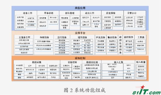 2.3?系统功能组成结构。系统功能可划分为感知控制、支撑平台、固定典型应用和机动典型应用 4 个部分,如图 2所示。