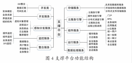 2. 支撑平台功能。支撑平台功能结构图 4 所示,主要由开发类、开发服务、感知分发服务、监控服务、整合服务、存储服务、云服务引擎、组件服务、运行服务和数据处理服务等 10 类服务组成。