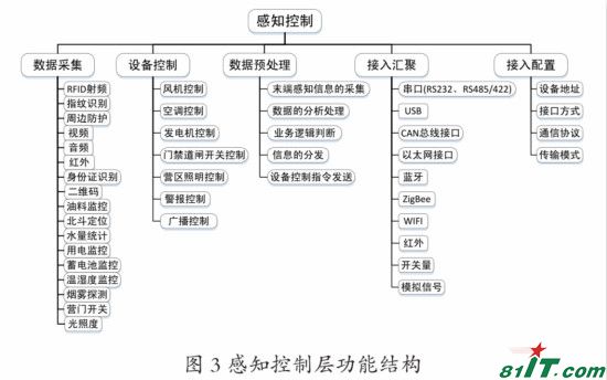 1. 感知控制功能。感知控制层功能结构图 3 所示,按照信息处理流程,可分为数据采集、设备控制、接入汇聚、接入配置和数据预处理 5 大功能,以及支持感知设备运行的接入配置功能。其中,数据采集通过集成各种传感设备,采集RFID射频、指纹识别、周边防护、视音频、红外、身份证识别、二维码、油料监控、北斗定位、水量统计、用电监控、蓄电池监控、温湿度监控、烟雾探测、营门开关、光照度等感知数据;设备控制可实现空调、风机、发电机、门禁道闸开关、营区照明、警报和广播等设备的远程控制;接入汇聚为各类数字、模拟感知设备提供了串口、USB、CAN 总线、以太网、蓝牙、ZigBee、WIFI、红外等接入和汇聚方式;数据预处理则进一步可区分为末端感知信息采集、数据分析处理、业务逻辑判断、信息的分发和设备控制指令发送等 5 项子功能;接入配置提供设备地址、接口方式、通信协议和传输模式等4 类配置参数设置功能。