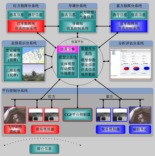定制运行控制系统,包括导控、指控、三维控制等,其中导控台用于控制仿真仿真运行、暂停、快进,修改兵力与任务等,指控台用于指挥员进行人在回路指挥训练,三维控制台用于控制三维视点记录与切换。
