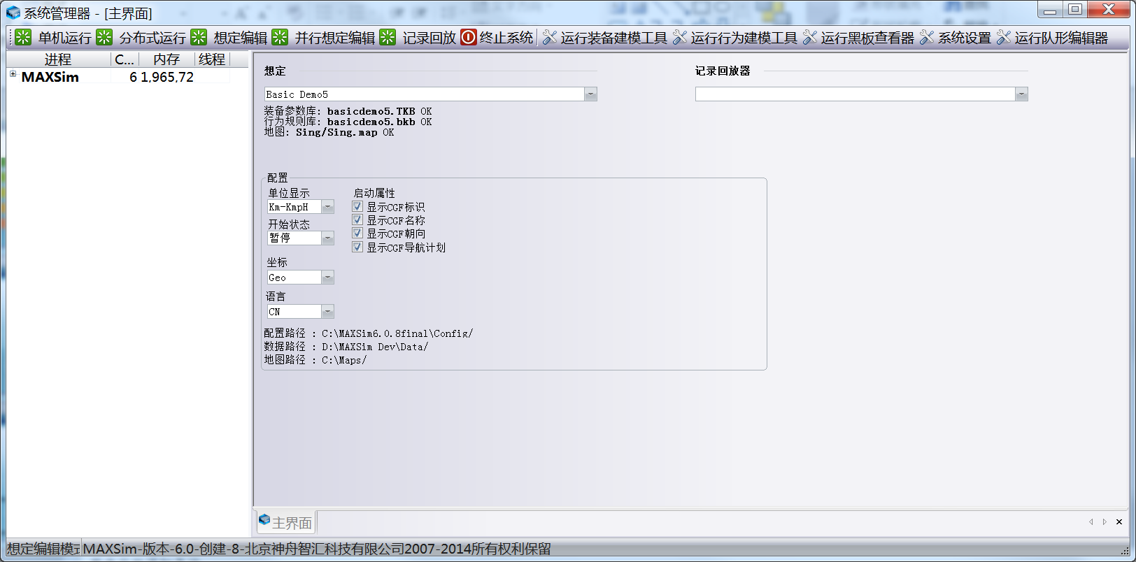 集中管理模型编辑工具、想定编辑工具、队形编辑、系统设置、单机运行、分布式运行、想定回放等内容,并可以对系统运行的进程状态进行监控。