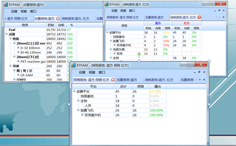实时仿真运行监控工具,可对战场各方的实体状态、属性进行查看并可实时进行指挥干预,可对同一决策点进行多分支想定运行,可很好的支持训练、演习及战法研究。