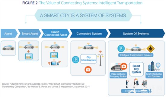 图2以城市交通为例说明了智慧城市规模效应和互联性的重要性。随着像汽车这样的实物资产变得“智能”和数字化,这些汽车将会连接到网络,成为其他智能系统的一部分,这些系统可以共享、交流和协作。这就是城市数字化转型带来的挑战。信息和通信技术将是这个系统的奠基石。
