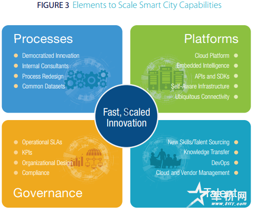 而且,在面临的挑战如此复杂时,也存在管理投资新技术的风险。IDC的研究指出了要加快和扩大智慧城市转型,城市应打牢这四个方面的基础(见图3):流程,平台,人才,治理。
