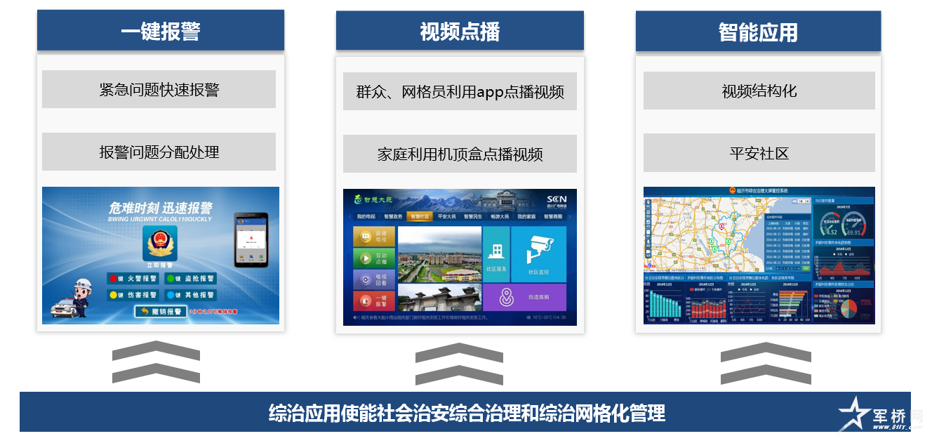 实现面向综治、公安、政府职能部门、企业公众等的四类视频应用场景。