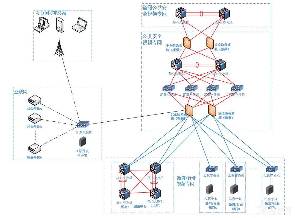 实现公共安全视频专网、政府/行业视频专网、互联网的视频资源联网三类网络资源汇聚和共享发布。
