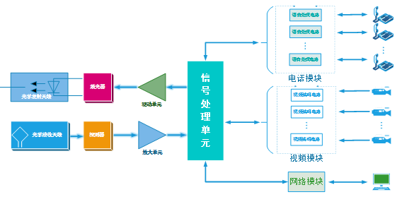 无线激光综合业务通信机主要由光学收发系统、光电信号处理系统以及业务接入系统三部分组成。