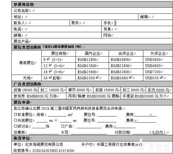 欢迎参加“2018第二届中国军民两用科技装备展览会”,为确保贵公司顺利参展,取得良好展出效果,组委会将竭诚为您提供专业、热情、周到的参会组织服务工作。