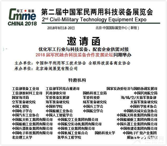 为推动军民融合战略深度发展,促进军工装备质量不断提升,“第二届中国军民两用科技装备展览会”将于2018年9月在北京举办。展会以“智造新动能 促进军民融合持续发展 ”为主题,集中展示航空航天、船舶、兵器、智能装备等领域高科技装备及配套产品,为军民技术协作创新提供突破,以设备采购产品销售为核心,构建军方、军工企业、民口企业为一体贸易洽谈、技术交流、投资合作的开放平台,推动科技装备军民成果的转化。 届时邀请工信部、发展改革委、国防科工局、军委装备发展部、海/陆/空/火箭军装备部、军工集团、科研院所、民口配套单位、国内外制造业相关单位参展参会,携手推进军民融合科技装备进程,助力国防和经济建设更好更快发展。