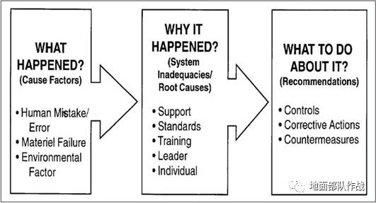3.要更重视“为什么”。陆军对所有的事故信息进行了分门别类。可能每个指挥员关注的重点不同,但跟踪研究的技术是相同的。我们对所有发生的损失进行分类管理,同类型的编为一组,目的是通过大量同类型案例,让指挥员能够感悟到问题发生的原因,从而在现实中提前觉察到某种趋势并提前采取控制措施。这并不是分析“发生了什么”,而是把信息编组为可管理的信息段。所谓分析是指“通过对事物的学习研究,找出其规律和事物之间的相互关系”。而编组是对事物进行排列组合,便于快速检索或定位或把事物按特定顺序排列。查出事故“为什么”会发生,就必须找出其根本原因,而不是对事故进行简单的罗列。同时,你也不可能在没有了解“为什么”的情况下完全掌握“是什么”。陆军出版的手册385-40《陆军事故调查和报告》中给出了信息收集、分析和推送的“3W”方法。