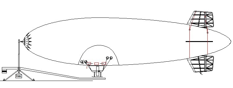 该型飞艇采用类似常规飞艇的布局:流线形主气囊 “+”形尾翼,吊舱布置在主气囊的下面。头锥用于加固头部,防止凹陷,便于系留。用于野外锚泊系留,配重块野外固定,可以随风转动,增加锚泊抗风能力。