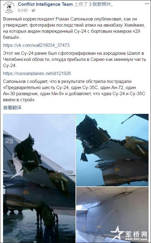 2018年1月4日,俄罗斯驻叙利亚郝明梅空军基地遭到迫击炮的炮击,尽管俄国防部否认“7架军机被摧毁”的报道,但网络上仍传出的相关图片显示装备损坏严重。照片显然是内部军人拍摄,让俄罗斯很恼火。