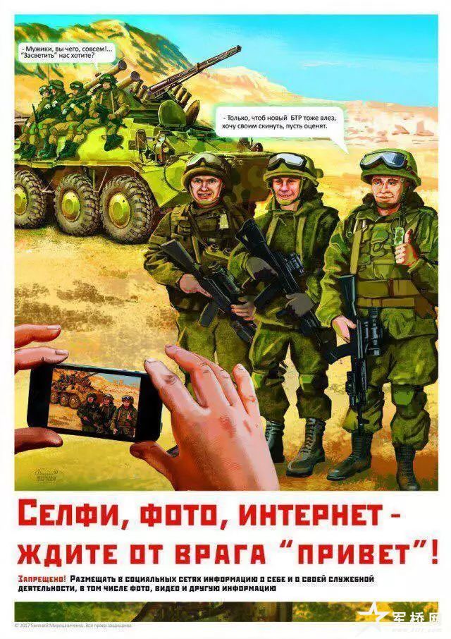 图为俄罗斯的保密防谍海报,不要为了炫耀就打卡拍照。在战场或演习场上用智能手机拍照并上传到自己的个人社交账号时,就会出现泄密情况。