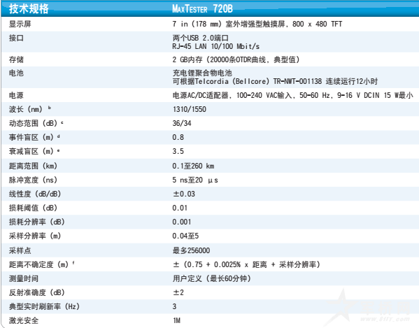 MAX-720B OTDR/iOLM具有36 dB的动态范围和0.8-3.5 m的盲区。这足以确保有效地测试相距很近的事件,如在CO中测试跳线和配线架它还针对接入网中的点对点测试进行了优化。
