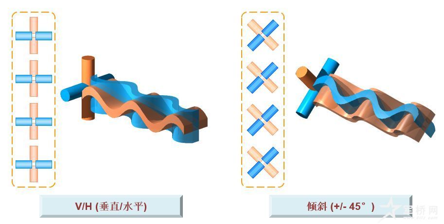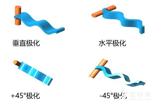 如果电波的电场方向垂直于地面,我们称它为垂直极化波。同理,平行于地面,就是水平极化波。另外,还有±45°的极化。
