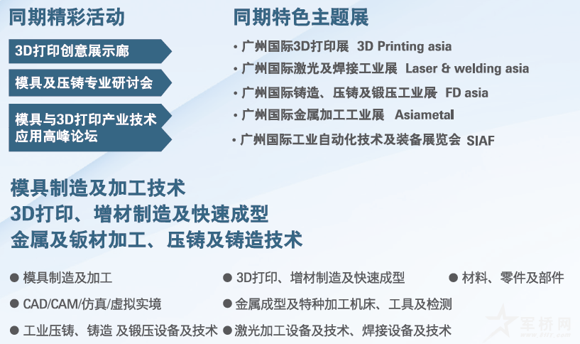 第十二届广州国际模具展览会(Asiamold)将于2018年3月4至6日于广州中国进出口商品交易会展馆隆重举行。展会致力为模具、压铸及锻压和增材制造行业展示前沿技术、产品及方案。Asiamold将再次与SIAF广州国际工业自动化技术及装备展览会同期举行,预计两展共同吸引来自20个国家及地区、共850家参展商,总展览面积超过60,000平方米。