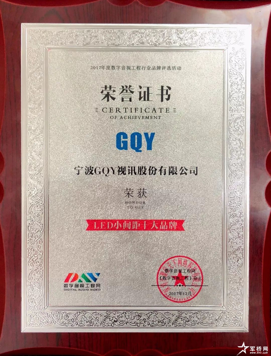 由中国数字音视工程网、《数字音视工程》杂志主办的“2017年度数字音视行业十大品牌”评选活动的结果新鲜出炉,GQY视讯凭借根基深厚的大屏显示技术实力,及新推出的小间距LED显示屏具有无拼缝、亮度高、色彩柔和、对比度高、图像响应速度快的特点,一举获得“2017年度LED小间距十大品牌”奖。中国数字音视工程网、《数字音视工程》杂志为获奖企业颁发了奖牌。