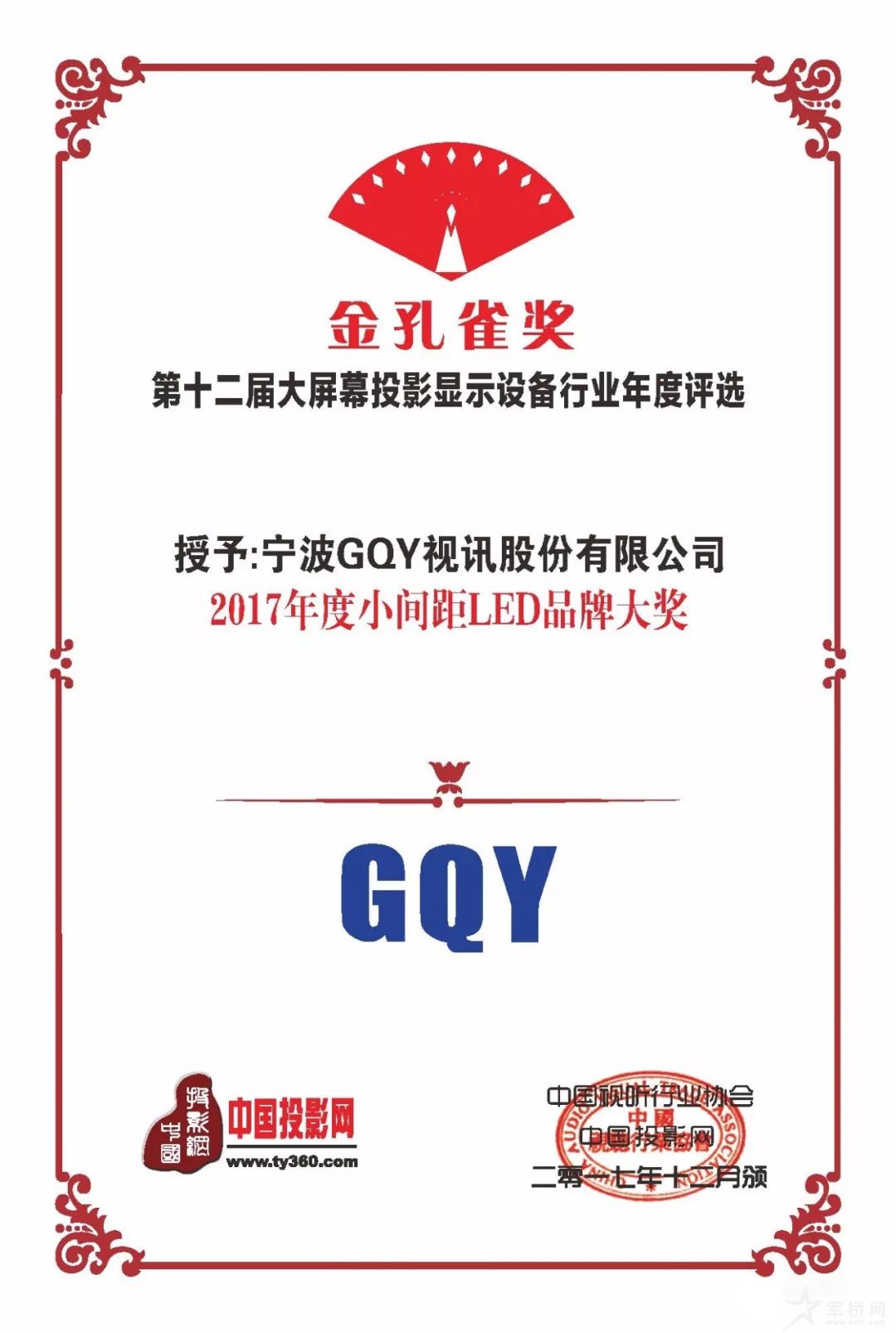 GQY视讯作为国内第一家大屏拼接显示系统供应商,凭借在小间距LED显示行业的行业实力,在“2017视听行业高峰论坛暨第十二届大屏幕投影显示设备行业年度评选颁奖典礼”上斩获“2017年度小间距LED品牌大奖”。