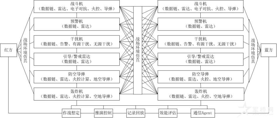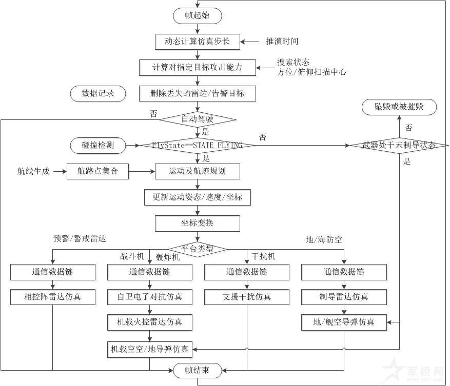 仿真过程中,红蓝双方的战斗机平台主要仿真数据链、机载火控雷达、自卫电子对抗、机载空空导弹的火控和弹道的工作过程;轰炸机主要仿真数据链、机载火控雷达、空地导弹的火控和弹道的工作过程;预警机主要仿真机载预警相控阵雷达的探测能力和基于数据链的情报分发能力;干扰机主要仿真数据链、机载告警、随队干扰、支援干扰、无源干扰的工作过程;地(海)面引导/警戒雷达主要仿真地(海)对空雷达对空中目标的探测、跟踪及情报分发、指挥引导能力;防空导弹系统主要仿真制导雷达的目标探测、跟踪能力和地空导弹的火控、弹道计算过程。系统具有独立的碰撞检测和数据记录模块,以进行第三方的实体坠毁或摧毁判决。