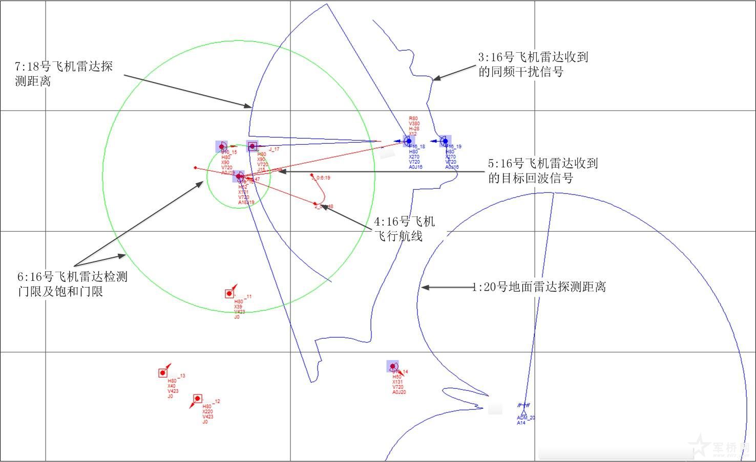 图中5号红色曲线表示红方16号飞机雷达接收到的目标回波功率分布情况,6号曲线指示的绿色内环表示雷达的检测门限,绿色外环与内环的差值表示雷达接收机的动态范围,3号曲线表示16号飞机雷达接收到的干扰信号功率分布情况。经分析,红方16号飞机雷达和15号飞机雷达的工作频点相同,在没有采取抗干扰措施的情况下,红方16号飞机雷达受到严重的同频干扰,协同失败,并被蓝方18号飞机击落。