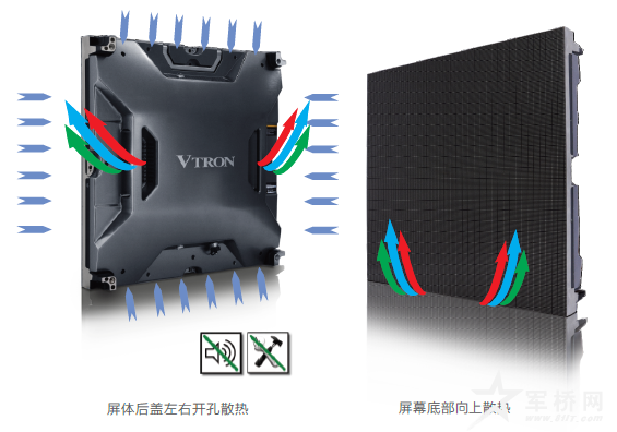 威创VLED显示单元采用金属一体化压铸成型结构,热传效果远超传统塑料外壳,更有利于VLED发光部件的散热,提高使用寿命;金属外壳结构电磁屏蔽性能远比塑料效果好,此外单元内部无风扇设计,彻底无噪音,更适合室内应用。