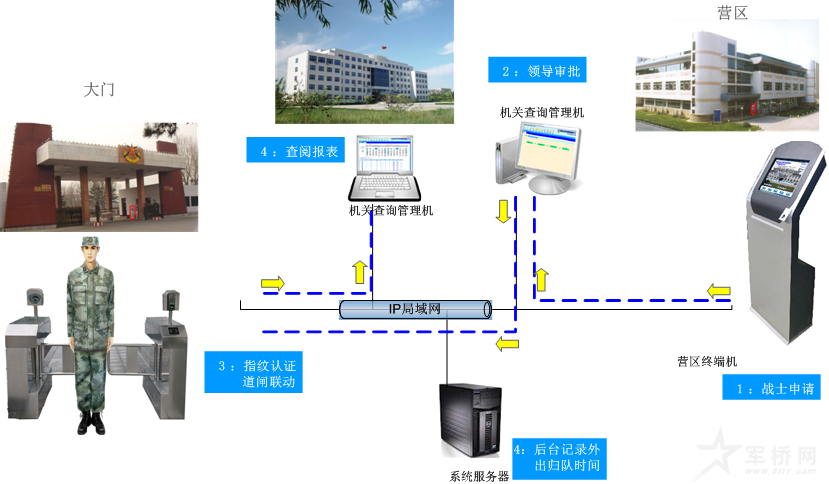 系统亮点:①人员进出正规有序;②连接公安网实时比对来访人员信息,防止不法分子混入营区;③内部人员刷指纹进出门禁,外来人员刷访客卡进出门禁;④实时统计人员在位情况并在指控中心显示。