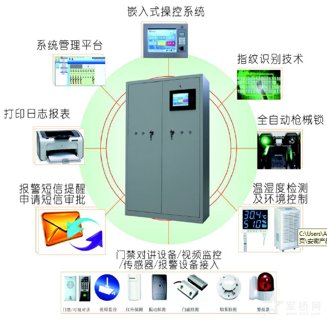 系统功能:①指纹识别认证;②枪弹自动存取;③使用过程记录;④在位状态监控;⑤探测联动报警;⑥超时超限报警;⑦枪弹使用申请审批;⑧酒精检测。