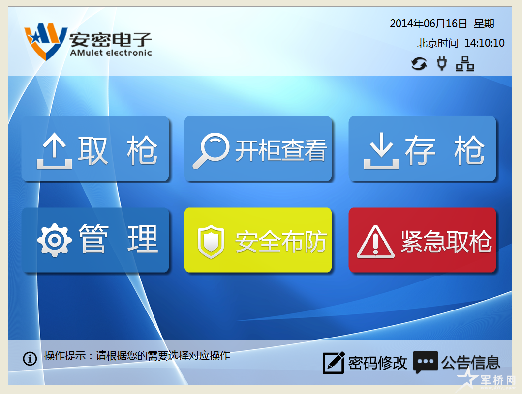 该系统综合运用先进的嵌入式、指纹识别、图像处理、无线射频识别、自动控制等多种先进技术,针对枪支弹药使用管理特点,对枪弹的分布式存取(存储)过程、枪弹在位检测、弹药消耗统计、超时归还报警、安全存储、防盗报警、智能监控、震动报警、酒精检测、非法取枪等进行智能化管理与监控的一体化管控系统。