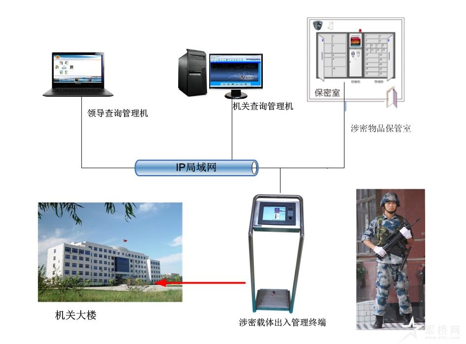 系统功能:①涉密物品授权出入管理;②人员与载体对应结合管理;③联动报警;④进出人员和涉密载体信息查验。