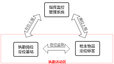 如上图所示,枪支物品在执勤时通过绑定的定位标签与定位基站进行数据交换,实现枪支物品(定位标签)的实时在岗、离岗监测。