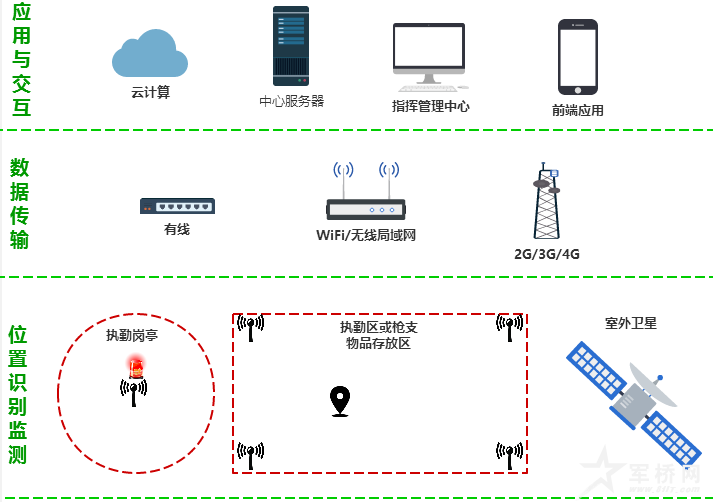 系统框架主要采用三层设计方案,分别为数据采集位置感知层、数据传输、应用交互;通过实现枪支物品在特定的区域内进行定位管理实现监管,若超出特定区域时将启动室外卫星定位模块做到室内外无缝对接定位技术。