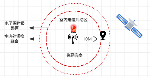 上图是定位标签从室内至室外交汇处定位模块切换示意图;如上图所示模拟执勤岗亭内的枪支定位管理,岗亭内安装定位基站和声光电报警,定位基站采用超宽带TOF测距技术为岗亭虚拟设置单个或多个等级报警区域范围;例如设置10米电子围栏(系统设置值),则表示以半径10米的范围内允许定位标签活动,定位标签若超出电子围栏设定范围值,系统后台将发出告警同时岗亭内声光电报警设备也发出报警。