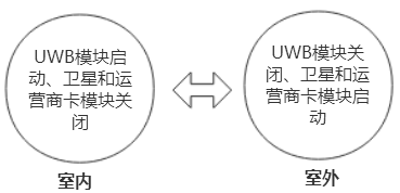 如上图所示,在室内只启用UWB定位模块进行定位可以达到长时间续航工作,定位基站若监测到定位标签离开室内定位区域后,定位标签将自动启动卫星定位模块,同时启动运营商卡模块数据传输将通过2G/3G/4G通道传输至应用层,通过流量卡完成室外定位数据的交互应用。