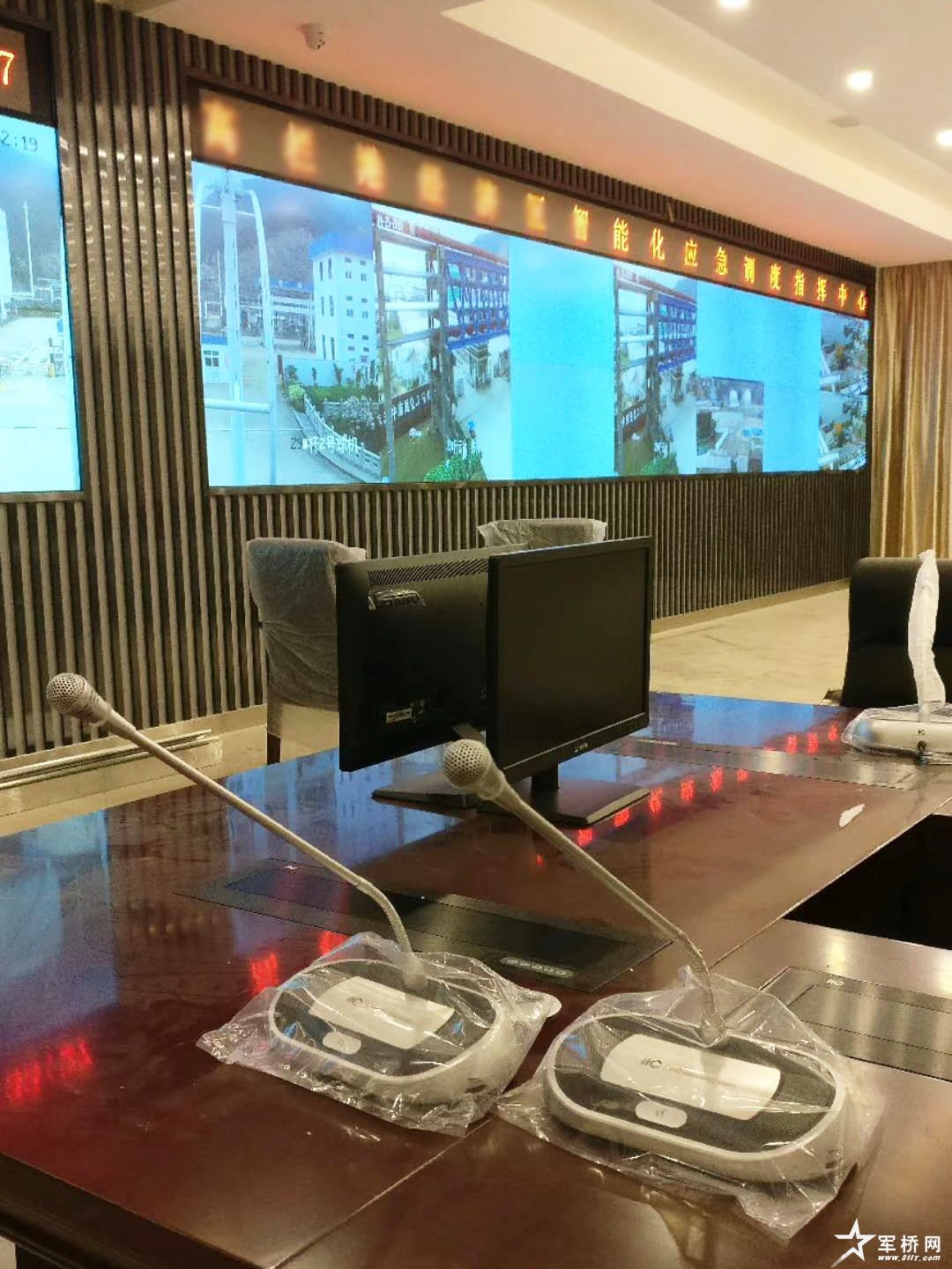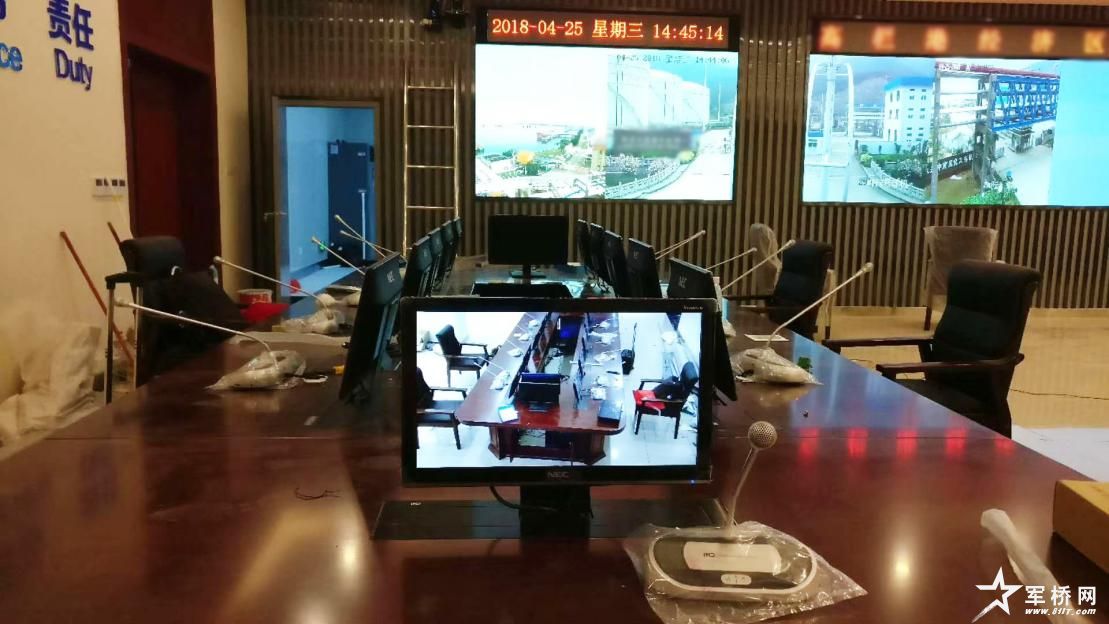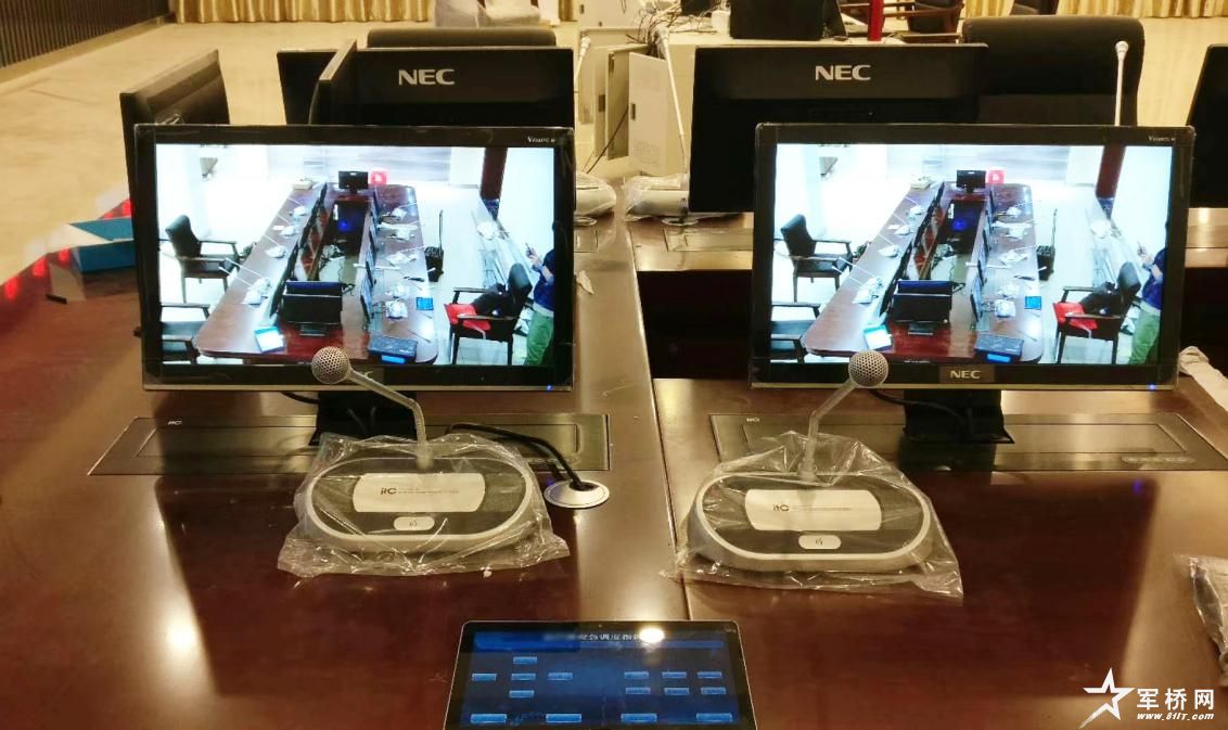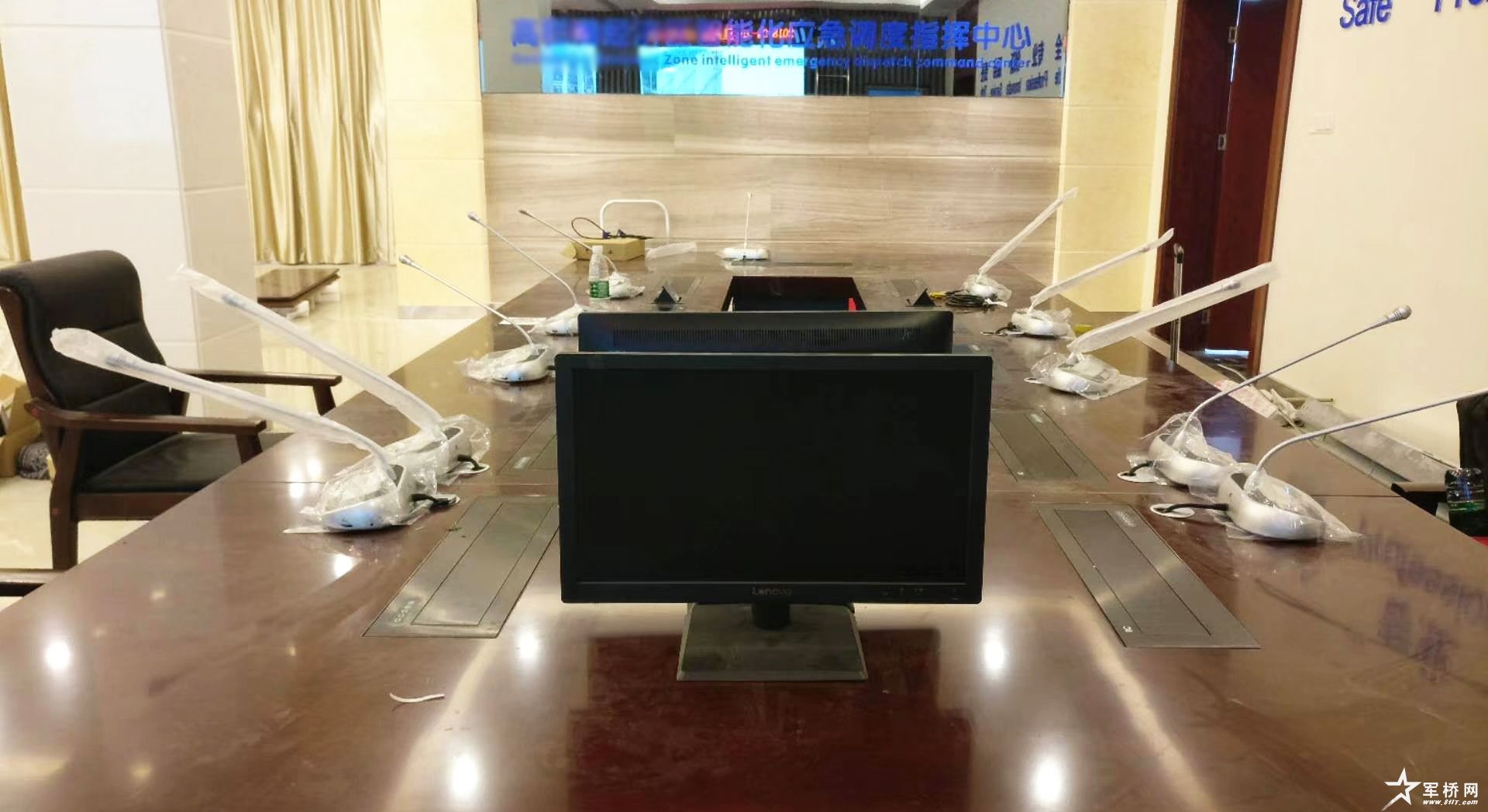 本套指挥中心解决方案共配置1台会议主机、11个会议单元以及11台升降器与显示器。其中,会议室内应用的itc数字会议系统,采用手拉手方式连接 ,布线量极少,既美观又实用,搭配专业扩声系统,保证会议室每个角落的声场听觉均匀。