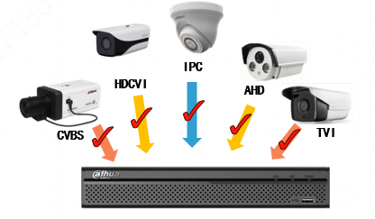 支持五种前端HDCVI、AHD、TVI、CVBS、IP五种摄像机任意接入,且支持HDCVI、AHD、TVI、CVBS自适应,实现互联互通。