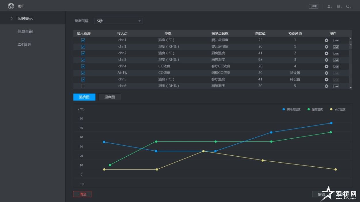 IOT方面的应用也可圈可点,支持预览和查询HDCVI温湿度相机温湿度功能、报警功能;并可针对温湿度绘制曲线,指导运维,为智慧物联提供基础数据。