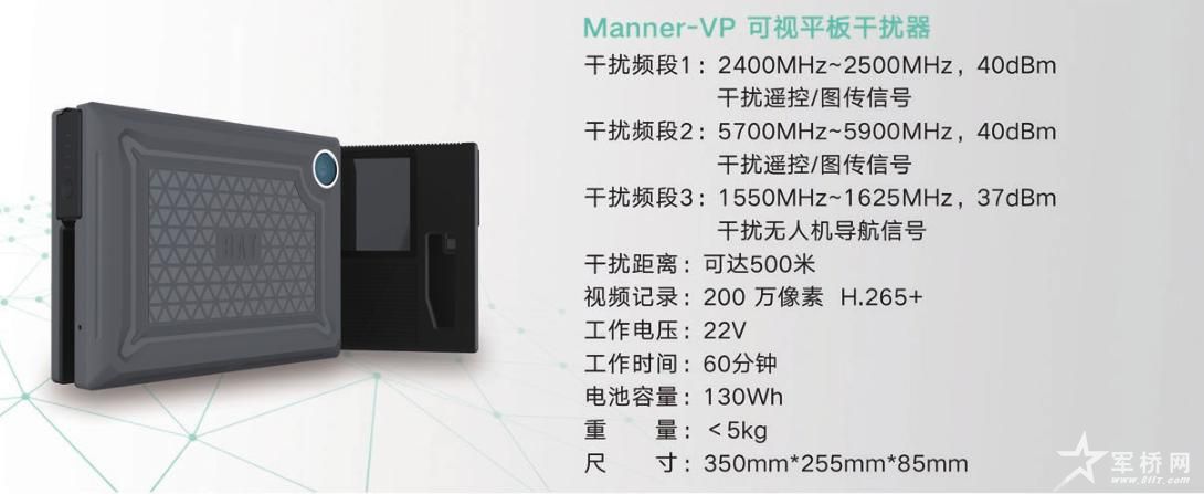 干扰频段1 : 2400MHz~ 2500MHz,40dBm,干扰遥控/图传信号干扰频段2 : 5700MHz~ 5900MHz, 40dBm,干扰遥控/图传信号干扰频段3: 1 550MHz~1625MHz,37dBm,干扰无人机导航信号干扰距离:可达500米工作电压: 1 6V工作时间: 60分钟电池容量: 65Wh重量: < 2.5kg 尺寸: 240mm*1 78mm*57mm