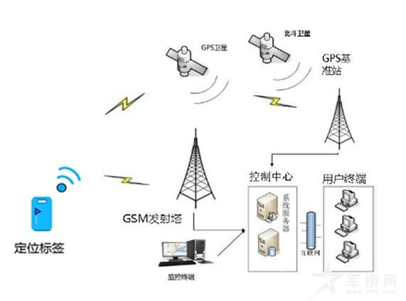军营营区外定位主要由定位标签、卫星、手持设备、基准站、发射塔和后台管理软件组成。