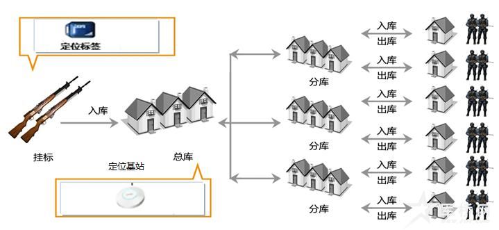 在大型仓库中,可通过宽带定位技术实现对仓储区域内外的货物、推车以及官兵的实时无缝高效的定位,并将定位信息及时准确的反映到仓储的控制中心,操作官兵可以在系统界面中实现对物资的实时监控、配送、管理和智能化调度等任务。